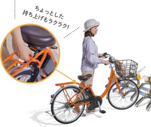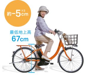 モーターをはじめ、フレームの軽量化とカーポンチップ配合バスケットを採用し、ショッピングモデル(24型)業界最軽量を実現。日々のちょっとした持ち上げをもっと快適に。 - 足つきがよく、乗り降り簡単