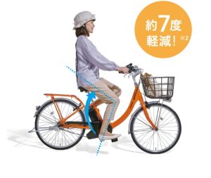 サドルの高さを従来品と比べて約5cm低くし、最低地上高67cmに。足をつきやすいので乗り降りの時や、停車時も安心です。 - 膝曲げらくちん、遠くへも快適に走れる